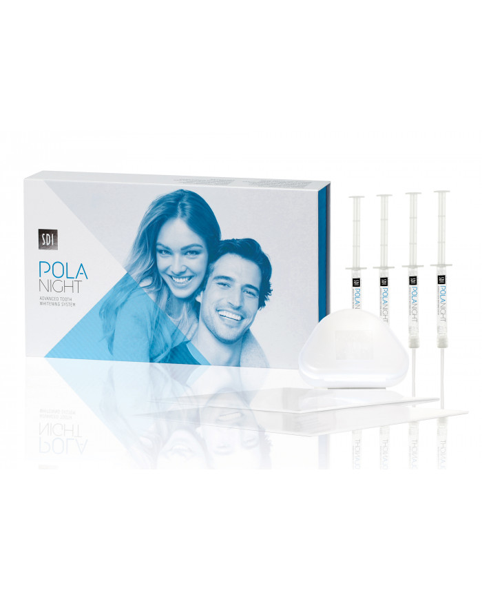 • Comme toute la gamme SDI, le Pola Night intègre la technologie "Desensitising" : une teneur élevée en eau pour hydrater la dent durant le traitement, combinée à des agents désensibilisants et un pH neutre pour protéger l'émail et les gencives. Sa viscosité élevée empêche le gel de fuir de la gouttière, même en position allongée.